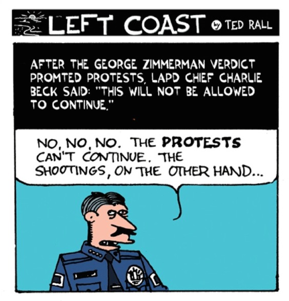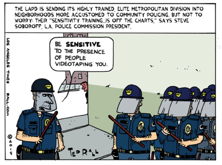 The details: On May 11, Ted Rall wrote his umpteenth column in the LA Times, LAPD’s Crosswalk Crackdown: Don’t Police Have Something Better to do? about gang violence: the gang is the LAPD. This was Rall’s lightest jab of all, a satirical remembrance of when, 14 years earlier, a cop put him in handcuffs for a simple jaywalking ticket.